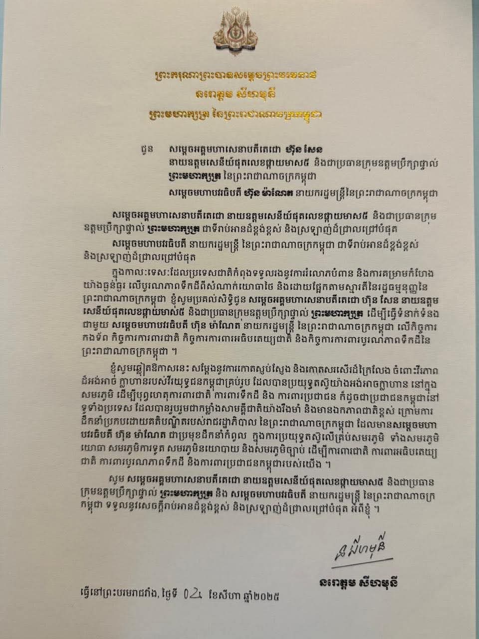 (ភ្នំពេញ) :សម្តេចតេជោ ហ៊ុន សែន ប្រធានព្រឹទ្ធសភា នៃកម្ពុជា តាមរយៈបណ្តាញសង្គមនៅយប់ថ្ងៃទី៤ ខែសីហា ឆ្នាំ២០២៥ បានបញ្ជាក់ខ្លឹមសារដូចតទៅ៖