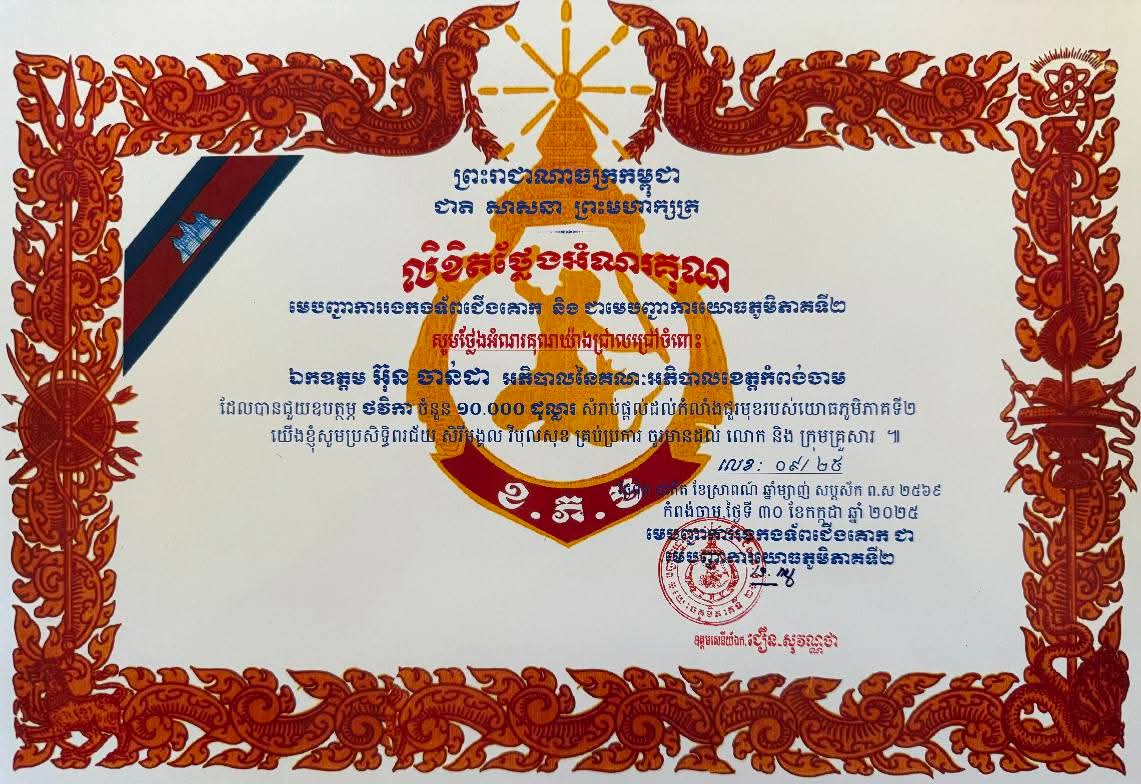 ឯកឧត្តម អ៊ុន ចាន់ដា អភិបាលនៃគណៈអភិបាលខេត្តកំពង់ចាម និងជាប្រធានគណៈបញ្ជាការឯកភាពខេត្ត បានឧបត្ថម្ភថវិកាចំនួន ១មុឺនដុល្លារ សម្រាប់ជួយដល់វីរកងទ័ពជួរមុខរបស់យោធភូមិភាគទី២ ក្នុងបុព្វហេតុការពារបូរណភាពទឹកដ។