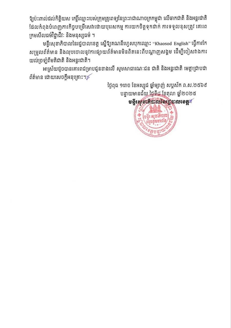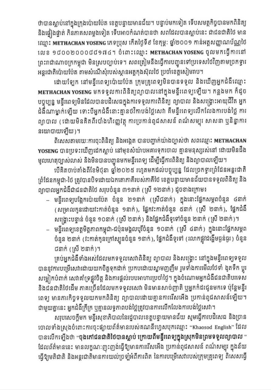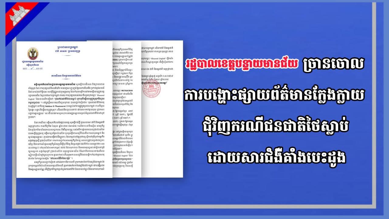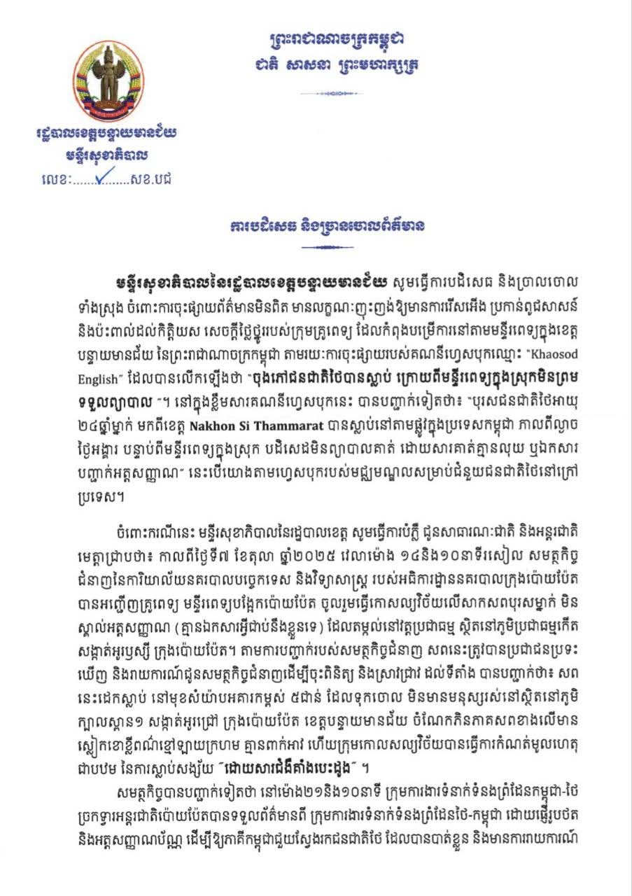 (បន្ទាយមានជ័យ): នៅថ្ងៃទី៨ ខែតុលា ឆ្នាំ២០២៥ រដ្ឋបាលខេត្តបន្ទាយមានជ័យ ចេញលិខិតបដិសេធ និងចោលចោលទាំងស្រុង ចំពោះការចុះផ្សាយព័ត៌មានមិនពិត មានលក្ខណៈញុះញង់ឱ្យមានការរើសអើង ប្រកាន់ពូជសាសន៍ និងប៉ះពាល់ដល់កិត្តិយស សេចក្តីថ្លៃថ្នូររបស់ក្រុមគ្រូពេទ្យ ដែលកំពុងបម្រើការនៅតាមមន្ទីរពេទ្យក្នុងខេត្តបន្ទាយមានជ័យ នៃព្រះរាជាណាចក្រកម្ពុជា តាមរយៈការចុះផ្សាយរបស់គណនីហ្វេសប៊ុកឈ្មោះ Khaosod Englishដែលបានលើកឡើងថា ចុងភៅជនជាតិថៃបានស្លាប់ ក្រោយពីមន្ទីរពេទ្យក្នុងស្រុកមិនព្រមទទួលព្យាបាល។