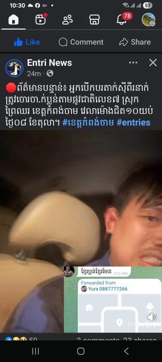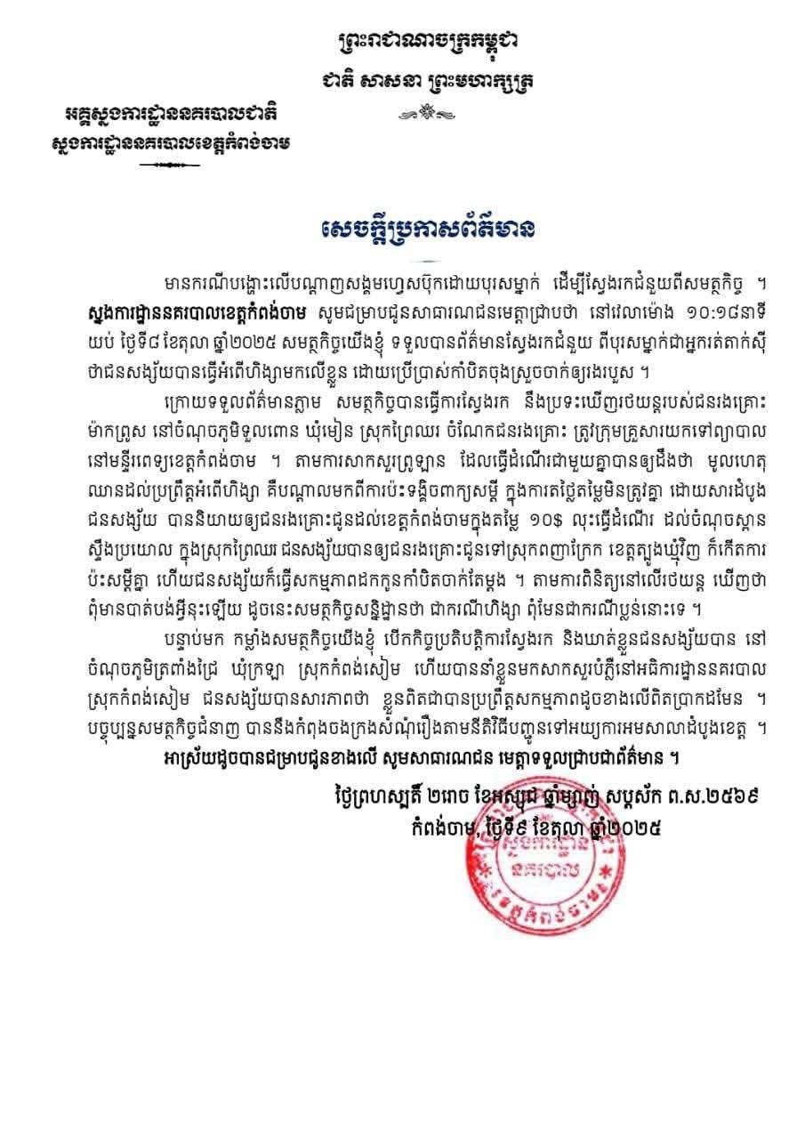 (កំពង់ចាម) :តាមការស្រាវជ្រាវបឋម លើអង្គហេតុ បន្ទាប់ជំនាញធ្វើការសម្ភាសន៍ ជនរងគ្រោះទាំង ២នាក់ និងផ្អែកតាមការពិនិត្យ នៅលើរថយន្ត គឺពុំមានបាត់បង់អ្វីនោះឡើយ ។ ករណីនេះ ជាករណីហិង្សា ដែលកើតឡើង រវាងភ្ញៀវជាអ្នកដំណើរ និងម្ចាស់តាក់ស៊ី ពុំមែនជាករណីប្លន់ទេ ។ នេះបើតាម លោកឧត្តមសេនីយ៍ទោ ហេង វុទ្ធី ស្នងការនគរបាលខេត្តកំពង់ចាម បញ្ជាក់ឲ្យដឹង នៅព្រឹកថ្ងៃទី០៩ ខែតុលា ឆ្នាំ២០២៥ នេះ ។