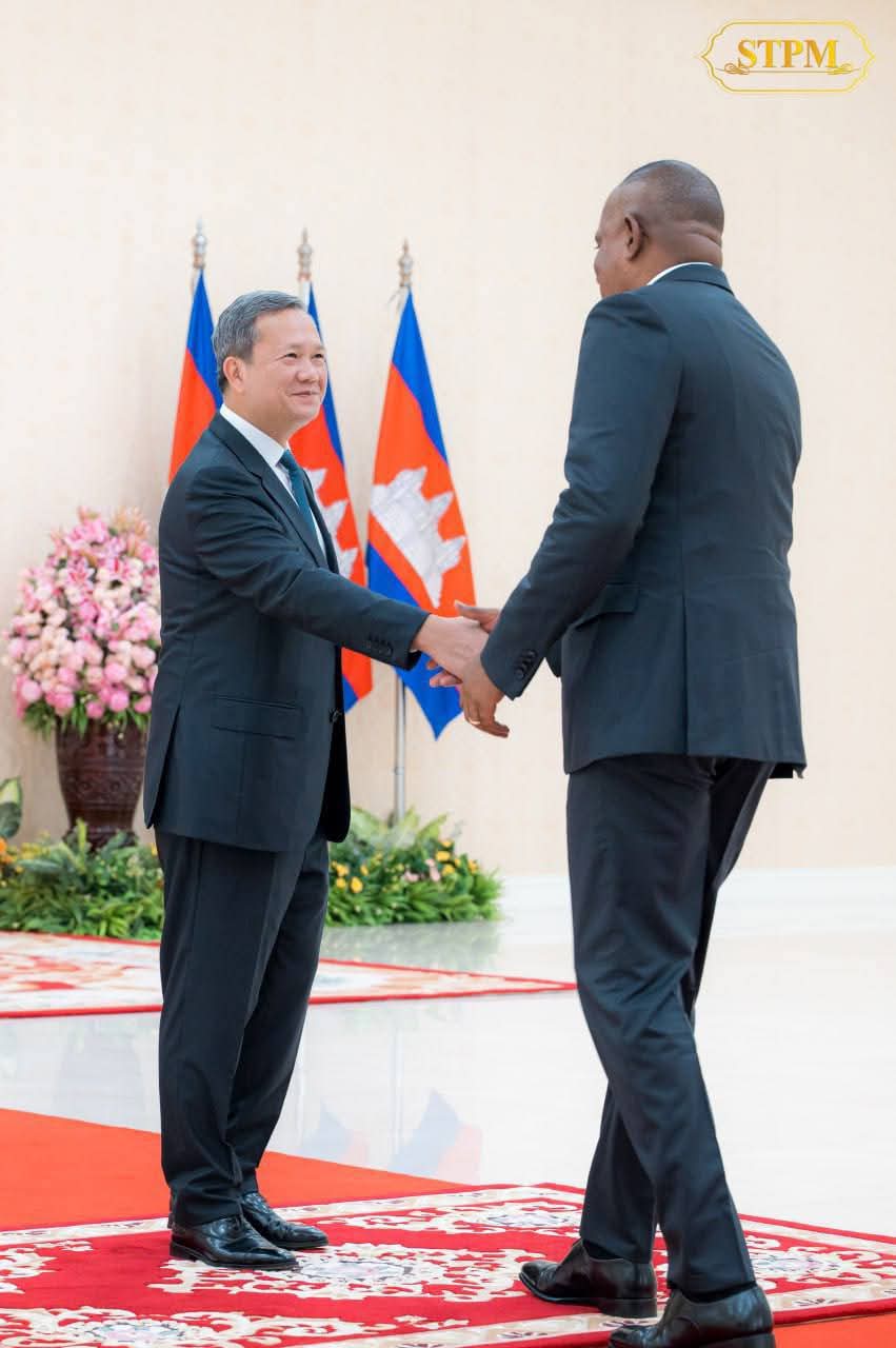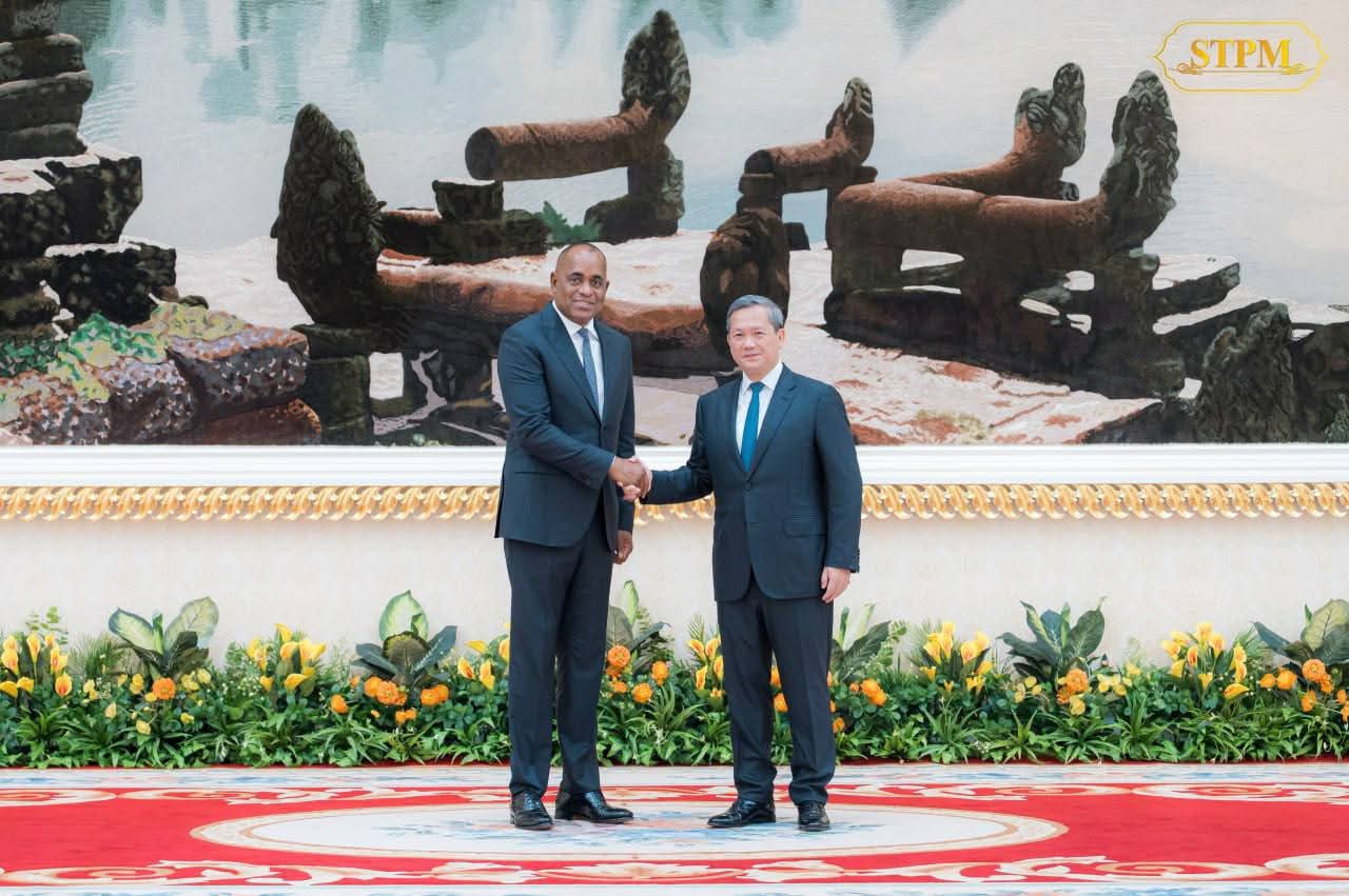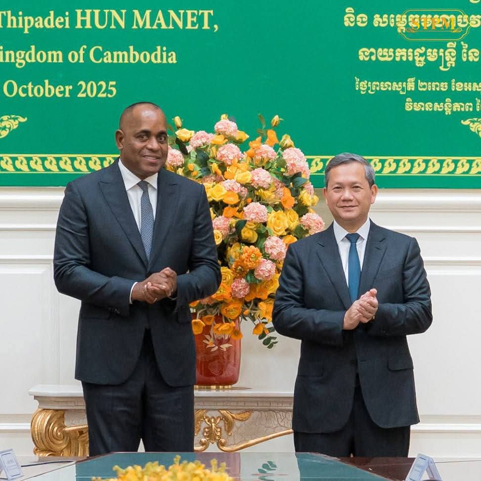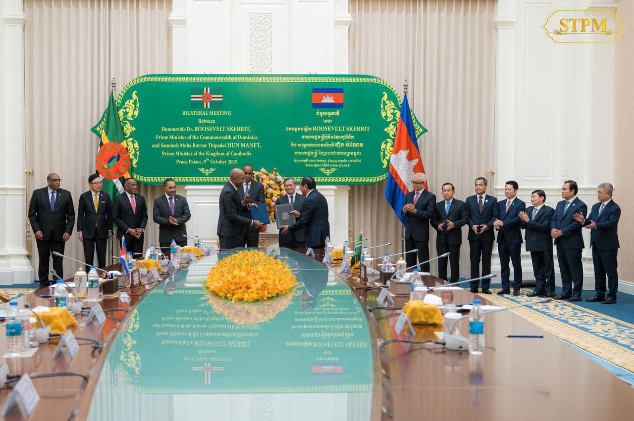 (ភ្នំពេញ) :សម្តេចមហាបវរធិបតី ហ៊ុន ម៉ាណែត នាយករដ្ឋមន្ត្រី នៃព្រះរាជាណាចក្រកម្ពុជា ទទួលជួបពិភាក្សាការងារទ្វេភាគីជាមួយ ឯកឧត្តមបណ្ឌិត Roosevelt Skerrit នាយករដ្ឋមន្ត្រីនៃកុំមិនវែលដូមីនីកា (Commonwealth Dominica) នាព្រឹកថ្ងៃទី០៩ ខែតុលា ឆ្នាំ២០២៥ នៅវិមានសន្តិភាព រាជធានីភ្នំពេញ ក្នុងឱកាសដែលឯកឧត្តមអញ្ជើញមកបំពេញទស្សនកិច្ចការងារ រយៈពេល៣ថ្ងៃ នៅព្រះរាជាណាចក្រកម្ពុជា។