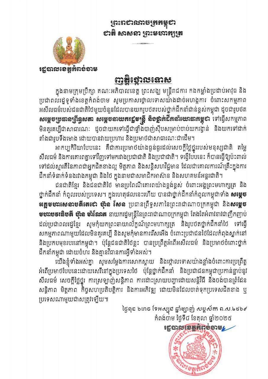 (ភ្នំពេញ)៖ ឯកឧត្តម អ៊ុន ចាន់ដា អភិបាល នៃគណ:អភិបាលខេត្តកំពង់ចាម ក្នុងនាមក្រុមប្រឹក្សា គណ:អភិបាលខេត្ត ព្រះសង្ឃ មន្រ្តីរាជការ កងកម្លាំងប្រដាប់អាវុធ និងប្រជាពលរដ្ឋទូទាំងខេត្តកំពង់ចាម សូមប្រកាសថ្កោលទោសយ៉ាងដាច់អហង្កការ ចំពោះសកម្មភាពអសីលធម៌របស់ជនជាតិថៃមួយចំនួនដែលបានយករូបថតរបស់ថ្នាក់ដឹកនាំជាន់ខ្ពង់កម្ពុជា ដូចជារូបថតទង្វើវាយប្រហារ និងគ្មានការគោរពប្រព្រឹត្តមកលើ សម្តេចប្រធានព្រឹទ្ធសភា សម្ដេចនាយករដ្ធមន្ដ្រី នឹងថ្នាក់ដឹកនាំយោធាកម្ពុជា ទៅធ្វើសកម្មភាពមិនគួរគប្បីជាសាធារណ: ដូចជាយកទៅធ្វើជាផ្ទាំងបា់សុីបសម្រាប់ចាប់យករង្វាន់ និងយកទៅដាក់តាំងជារូបទីមោង ដោយបានវាយប្រហារ និងប្រមាថជាសាធារណ:ជាដើម។