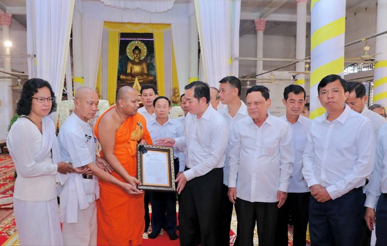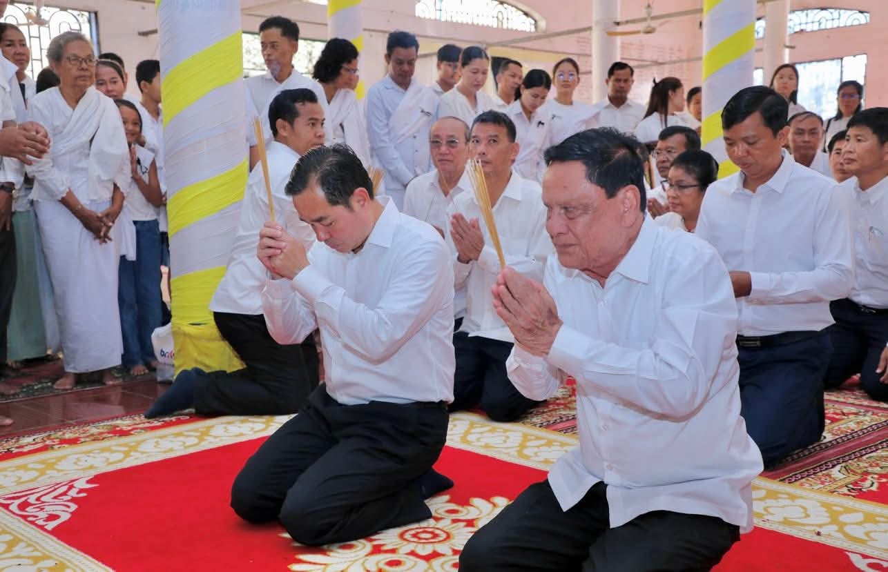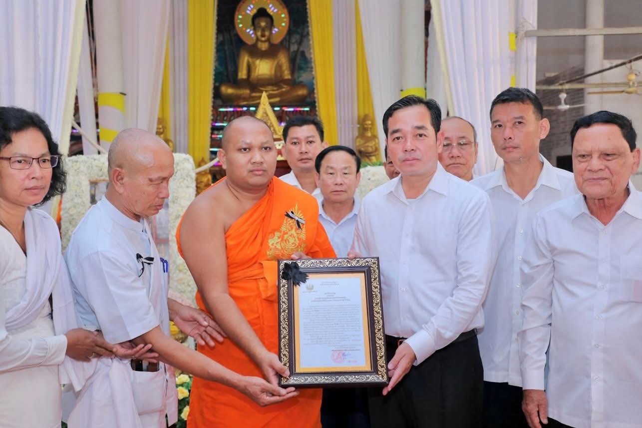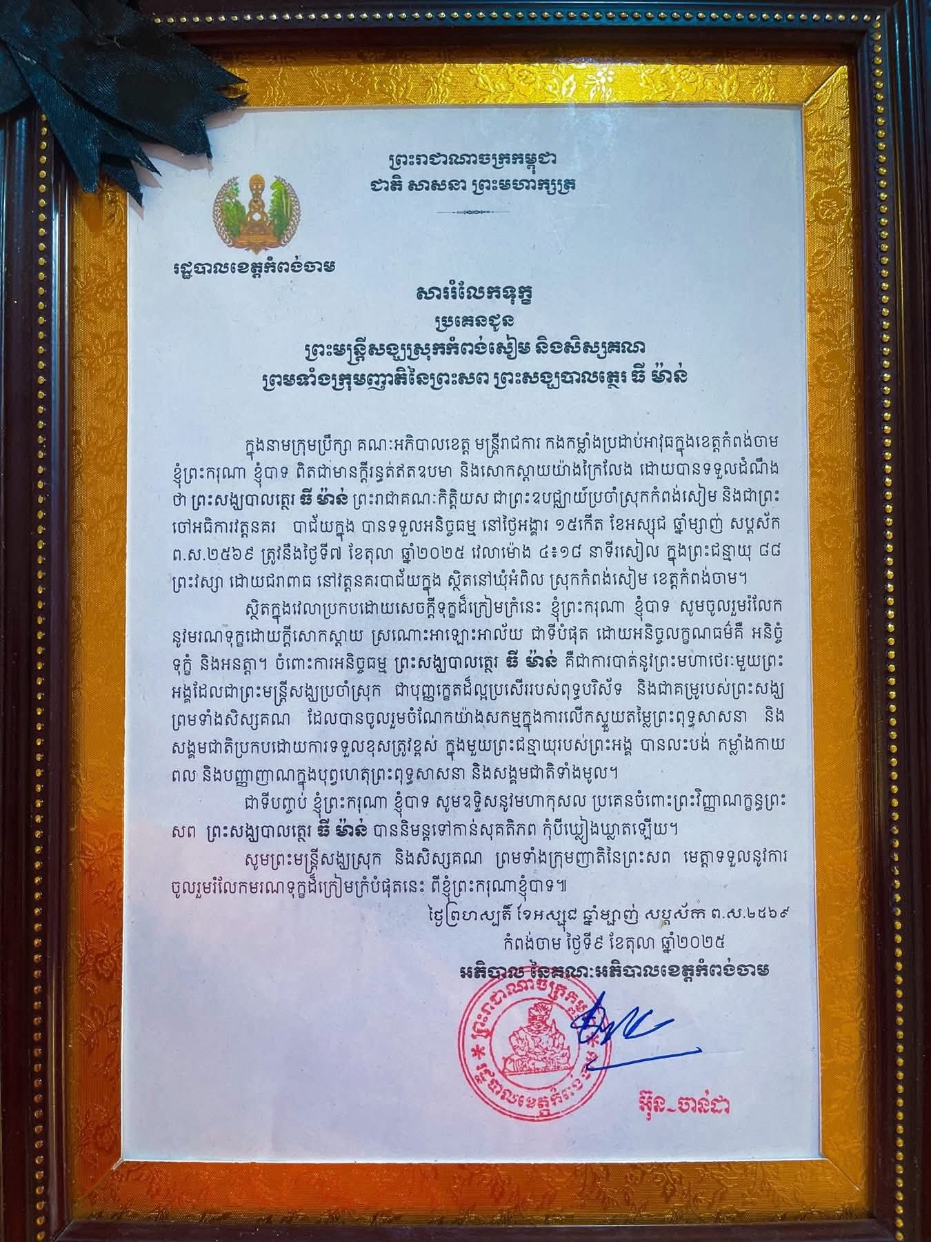 (កំពង់ចាម): ថ្ងៃសុក្រ ៣រោច ខែអស្សុជ ឆ្នាំម្សាញ់ សប្តស័ក ពុទ្ធសករាជ ២៥៦៩ ត្រូវនឹងថ្ងៃទី១០ ខែតុលា ឆ្នាំ២០២៥ ឯកឧត្តម អ៊ុន ចាន់ដា អភិបាល នៃគណៈអភិបាលខេត្តកំពង់ចាម និង ឯកឧត្តម ខ្លូត ផន ប្រធានក្រុមប្រឹក្សាខេត្ត និងសហការី អញ្ជើញចូលរួមរំលែកមរណទុក្ខ និងគោរពព្រះវិញ្ញាណក្ខន្ធព្រះសព ព្រះបាលត្ថេរ (ឥន្ទមុនី) ធី ម៉ាន់ ព្រះរាជាគណៈកិត្តិយសនៃព្រះរាជាណាចក្រកម្ពុជា ព្រះឧបជ្ឈាយ៍ប្រចាំស្រុកកំពង់សៀម និងជាព្រះចៅអធិការវត្តនគរបាជ័យក្នុង ដែលបានទទួលអនិច្ចធម្មកាល ពីថ្ងៃអង្គារ ១៥កើត ខែអស្សុជ ឆ្នាំម្សាញ់ សប្តស័ក ព.ស.២៥៦៩ ត្រូវនឹងថ្ងៃទី០៧ ខែតុលា ឆ្នាំ២០២៥ វេលា ម៉ោង៤:១៨នាទីរសៀល ក្នុងព្រះជន្មាយុ៨៨ ព្រះវស្សា ដោយព្រះជរាពាធ ស្តិនៅក្នុងវត្តនគរបាជ័យក្នុង ស្រុកកំពង់សៀម ខេត្តកំពង់ចាម។
