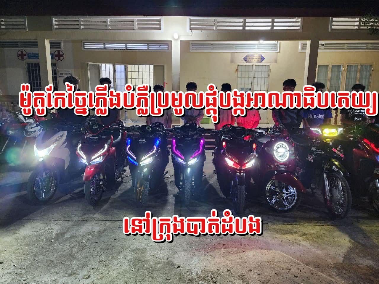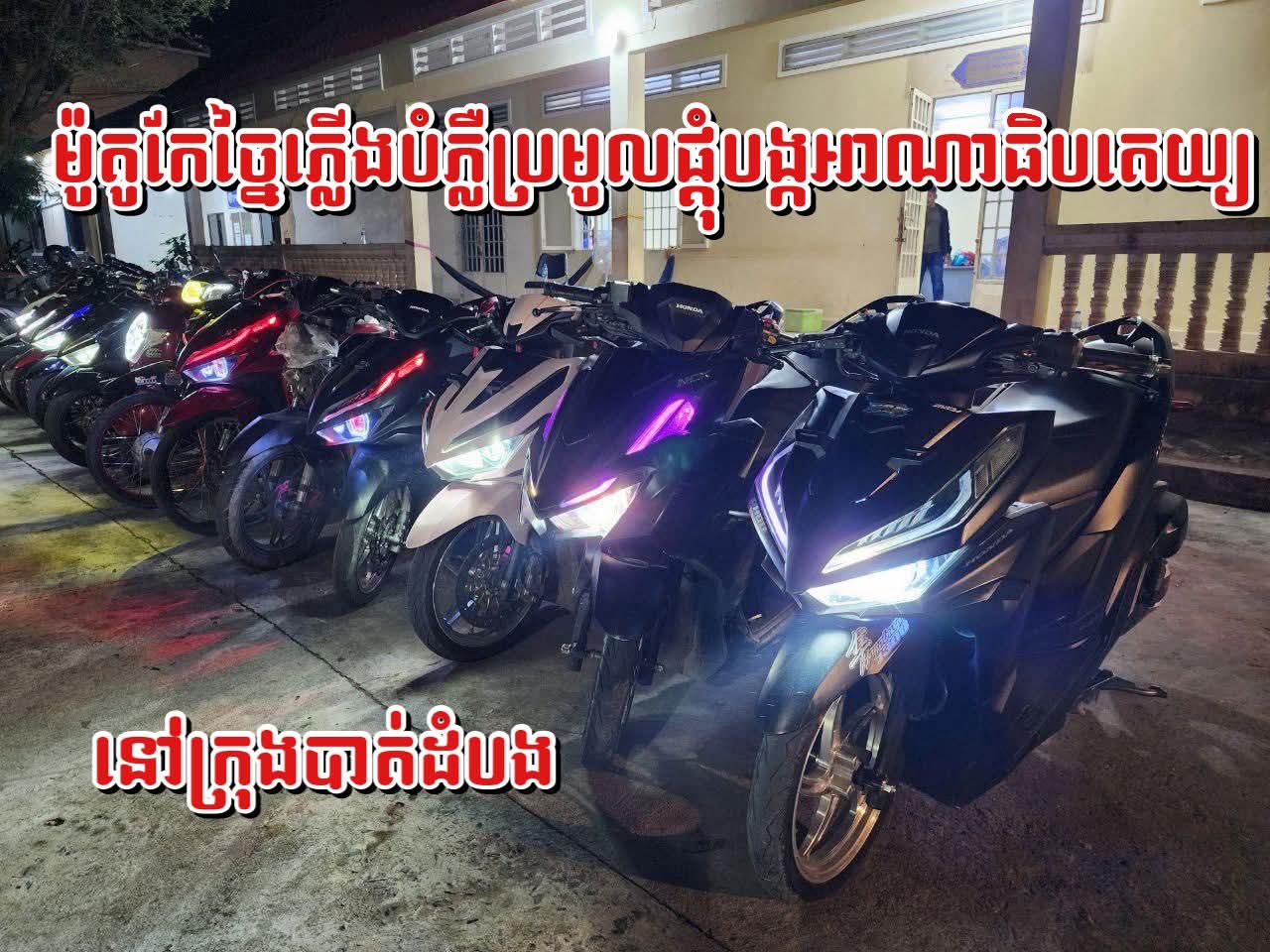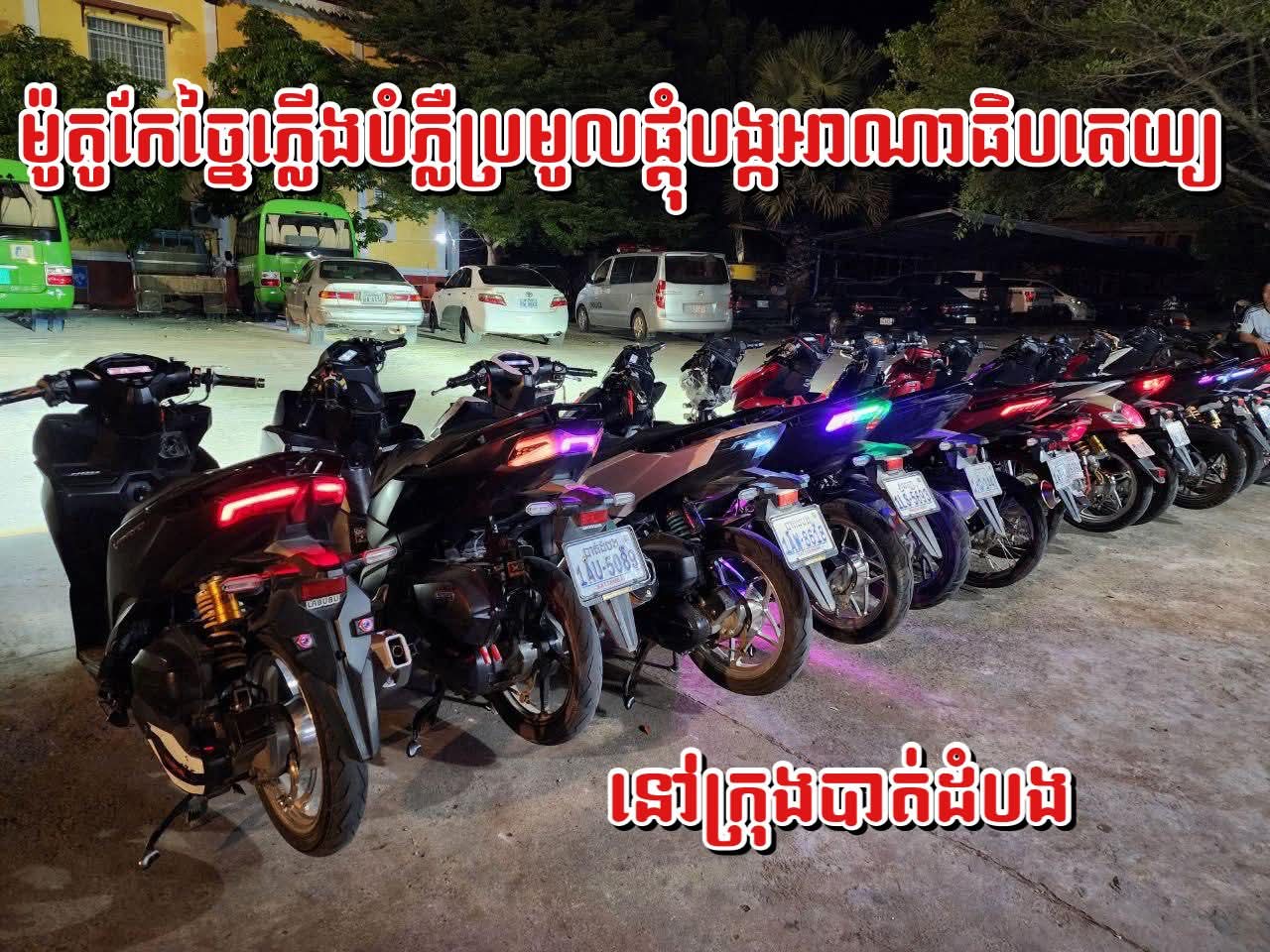 ប្រតិបត្តិការនេះធ្វេីឡេីងស្របតាមអនុសាស ន៍ដ៏ខ្ពង់ខ្ពស់ របស់ឯកឧត្តម នាយឧត្តមសេនីយ៍ ស ថេត អគ្គស្នងការនគរបាលជាតិ និងការចង្អុលដឹកនាំរបស់លោកឧត្តមសេនីយ៍ទោ ដាញ់ អេងប៊ុនចាន់ ស្នងការនៃស្នងការដ្ឋាននគរបាលខេត្តបាត់ដំបង លោកវរសេនីយ៍ឯក ឈឿង គឹមសុង ស្នងការរងផែនការងារនគរ បាលព្រហ្មទ័ណ្ឌ ដឹកនាំកម្លាំងក្រុមអន្តរាគមន៍បង្ការ-បង្ក្រាប សហការជាមួយកម្លាំងអធិការ ដ្ឋាននគរបាលក្រុងបាត់ដំបង នាំពួកគេប្រមូលផ្តុំជាក្រុម កែច្នៃភ្លើងម៉ូតូជិះពេលយប់ បង្កភាពអាណាធិបតេយ្យមកកាន់ស្នងការដ្ឋានដើម្បីធ្វើការសាកសួរនិងមានចំណាត់ការ កាល ពីយប់ថ្ងៃទី១៨ ខែ តុលា ឆ្នាំ២០២៥វេលា ម៉ោង ១៨និង០៤នាទីមានម៉ូតូចំនួន ១៣ គ្រឿង និងម្ចាស់ផង ។