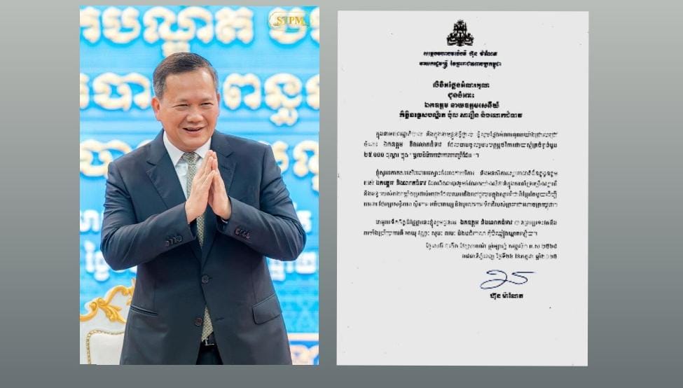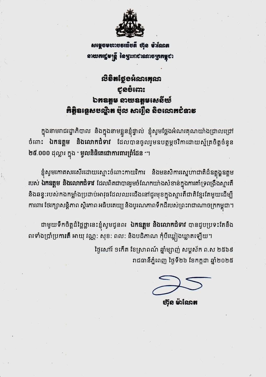 (ភ្នំពេញ)៖ សម្តេចមហាបវរធិបតី ហ៊ុន ម៉ាណែត នាយករដ្ឋមន្ត្រី នៃព្រះរាជាណាចក្រកម្ពុជា បានផ្ញើសារលិខិតថ្លែងអំណរគុណជូនឯកឧត្តម នាយឧត្តមសេនីយ៍ កិត្តិឧទ្ទេសបណ្ឌិត ប៉ុល សារឿន ឧត្តមប្រឹក្សាផ្ទាល់ព្រះមហាក្សត្រ និងលោកជំទាវ ដែលបានដែលបានចូលរួមឧបត្ថម្ភថវិកាក្នុង”មូលនិធិតេជោការពារព្រំដែន”។
