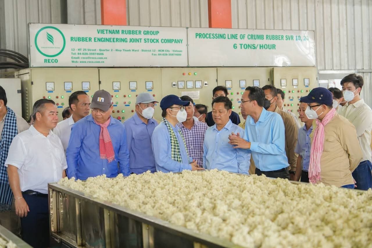 តមកទៀត ឯកឧត្ដមឧបនាយករដ្ឋមន្រ្តីប្រចាំការ និងប្រតិភូ ក៏បានបន្តចុះពិនិត្យខ្សែច្រវាក់ផលិតកម្មកែច្នៃកៅស៊ូរបស់ក្រុមហ៊ុន ស៊ី.អ.ស៊ី.ខេ.២ អភិវឌ្ឍន៍ កៅស៊ូ ឯ.ក និងក្រុមហ៊ុន បៀន ហៀក អ៊ិនវេសមេន ឯ.ក ក្នុងភូមិសាស្ត្រស្រុកស្ទោង។ ក្រុមហ៊ុនទាំងពីរ បានវិនិយោគលើការដាំដុះនិងកែច្នៃកៅស៊ូ ដោយដាំដុះលើផ្ទៃដី១៦ ២៦៨,៦៨ហិកតា ប្រើទុនវិនិយោគសរុបប្រមាណ ១០០លានដុល្លារអាម៉េរិក និងមានកម្មករសរុប ៣ ៦០០នាក់ ហើយក្នុងឆ្នាំ២០២៥នេះ បរិមាណជ័រកៅស៊ូកែច្នៃមានចំនួន ៤៨ ០០០តោន។