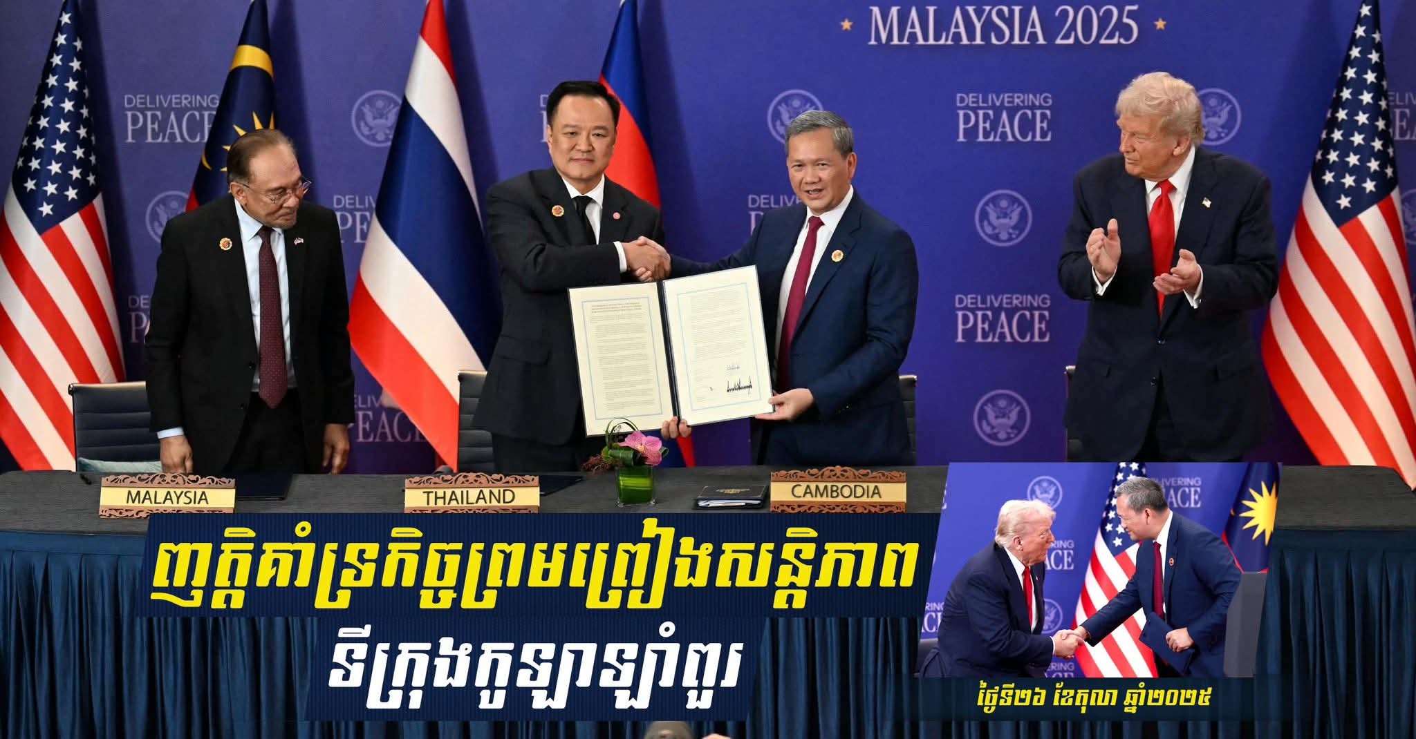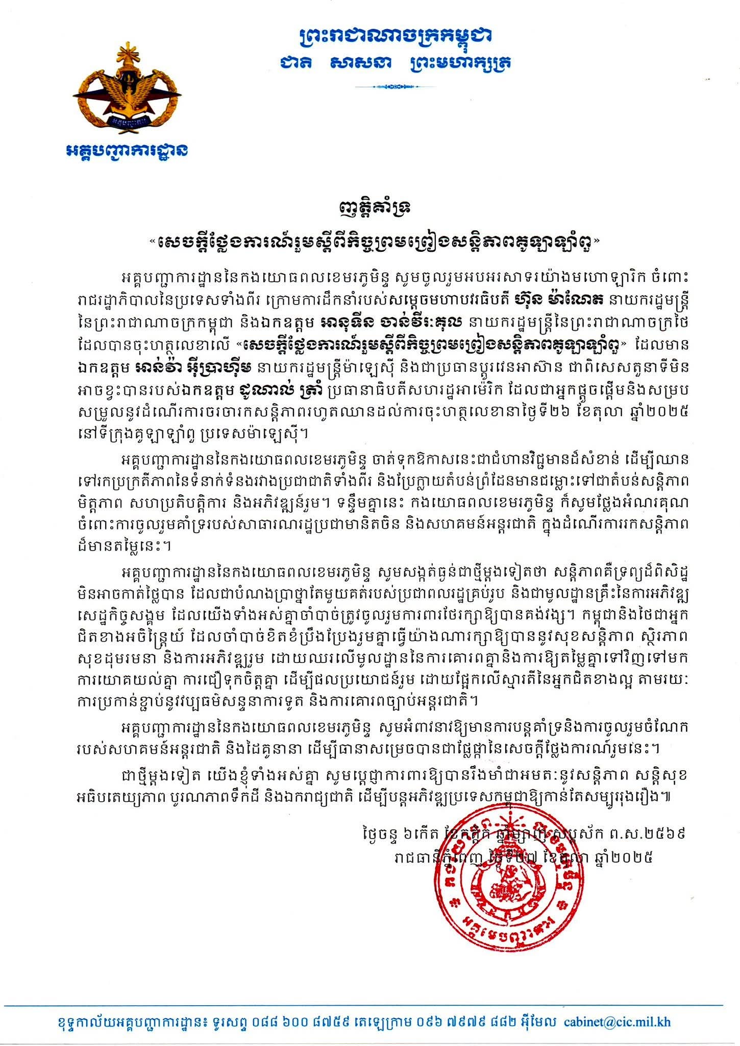 អគ្គមេបញ្ជាការ នៃកងយោធពលខេមរភូមិន្ទ សូមចូលរួមអបអរសាទរ ចំពោះកិច្ចខិតខំប្រឹងប្រែងរបស់រាជរដ្ឋាភិបាលនៃប្រទេសទាំងពីរ ក្រោមការដឹកនាំរបស់ សម្តេចមហាបវរធិបតី ហ៊ុន ម៉ាណែត នាយករដ្ឋមន្ត្រី នៃព្រះរាជាណាចក្រកម្ពុជា និងឯកឧត្តម អានុទីន ចាន់វីរៈគុល នាយករដ្ឋមន្ត្រី នៃព្រះរាជាណាចក្រថៃ និងតួនាទីស្នូលរបស់ ឯកឧត្តម អាន់វ៉ា អ៉ីប្រាហ៊ីម នាយករដ្ឋមន្ត្រីម៉ាឡេស៊ី និងជាប្រធានប្តូរវេនអាស៊ាន ជាពិសេសតួនាទីមិនអាចខ្វះបានរបស់ ឯកឧត្តម ដូណាល់ ត្រាំ ប្រធានាធិបតី សហរដ្ឋអាមេរិក។