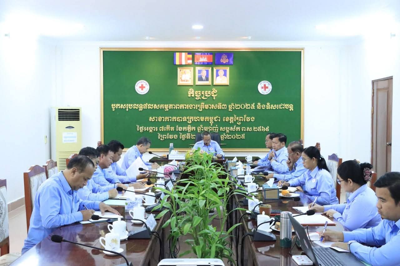 (ព្រៃវែង) : នៅថ្ងៃទី២៨ ខែ តុលា ឆ្នាំ២០២៥ សាខាកាកបាទក្រហមកម្ពុជា ខេត្តព្រៃវែង បានបើកកិច្ចប្រជុំបូកសរុបលទ្ធផលសកម្មភាពការងាររបស់សាខា កក្រក ខេត្តព្រៃវែង សម្រាប់ត្រីមាសទី៣ ឆ្នាំ២០២៥ និងទិសដៅអនុវត្តបន្ត ស្ថិតក្រោមអធិបតីភាព ឯកឧត្តម សួន សុម៉ាលីន ប្រធានគណៈកម្មាធិកាសាខាខេត្ត និងមានការអញ្ចើញចូលរួមពីសមាជិក សមាជិកា គណៈកម្មាធិការសាខាខេត្ត និងក្រុមប្រតិបត្តសាខាខេត្ត សរុបអ្នកចូលរួមចំនួន ១៧នាក់ ស្រី ៦នាក់ នៅសាលប្រជុំសាខាកាកបាទក្រហមកម្ពុជា ខេត្តព្រៃវែង។